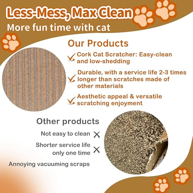 - 【New material combination–Cork& Corrugated Blend】This cat scratcher say goodbye to messy scraps! Our innovative blend of natural cork and durable cardboard provides superior grip and enjoyment, stimulating cats’ natural scratching instincts while being gentle on paws.