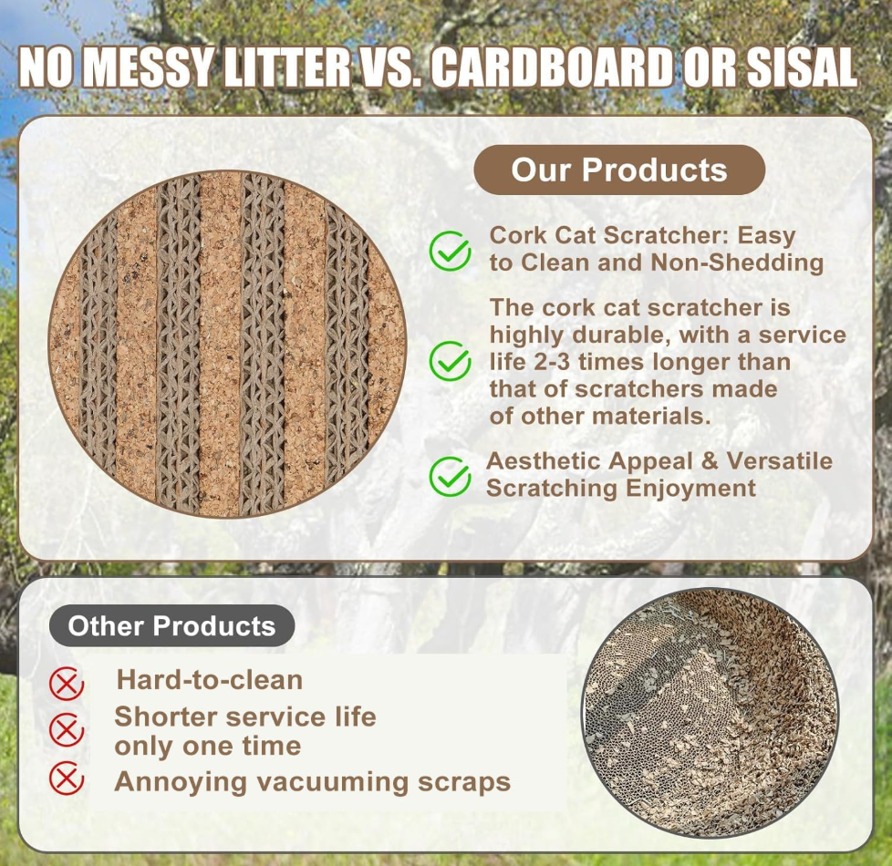 - 【Double the Fun, Zero Boredom!】–Is your cat judging your boring old cat furniture? Our cat scratch pad is the industry’s FIRST to mix corrugated cardboard with cork, giving your cat two awesome textures to pick from. It’s like a fun choice between “crunchy” and “scratchy”——so they’ll never get bored and never target your sofa again!